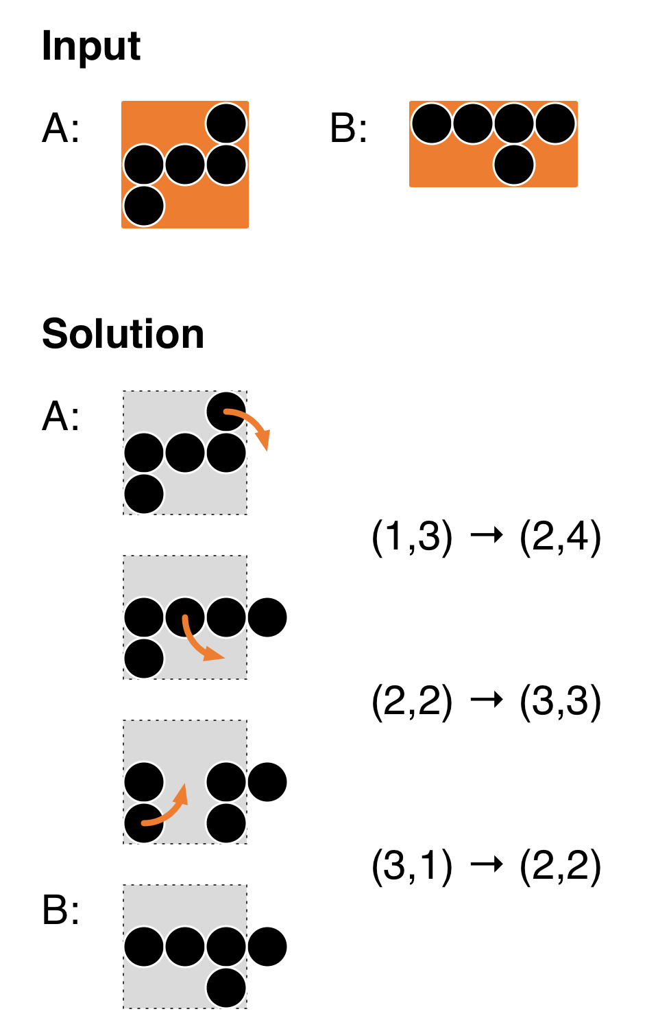 Then we can move a pebble from (r_1,c_1) to (r_2,c_2); such a move is denoted by (r_1,c_1) \to (r_2,c_2). See the figure below for an example of inputs and a sequence of 3 valid rotations that wins the game.