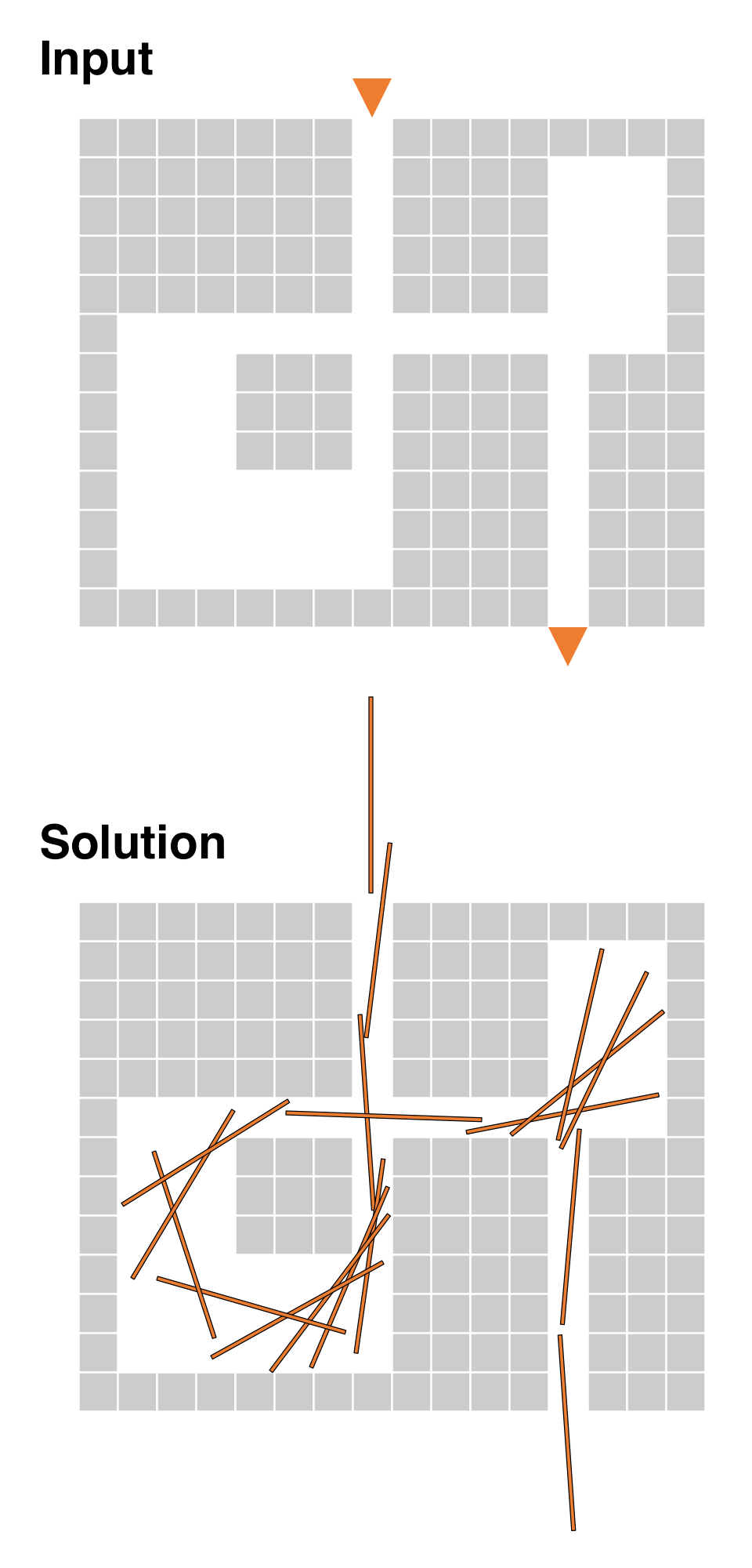 All blocks on the perimeter of the maze are walls, with the exception of the entrance and exit, which are empty.