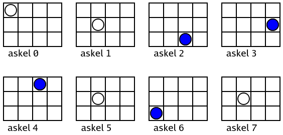 Seuraava kuva näyttää esimerkkinä, miten pallo alkaa liikkua 3 \times 4 -ruudukossa. Pallon sininen väri tarkoittaa tilannetta, jolloin suunta muuttuu.
