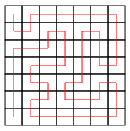 There are 88418 paths in a 7 \times 7 grid from the upper-left square to the lower-left square. Each path corresponds to a 48-character description consisting of characters D (down), U (up), L (left) and R (right).